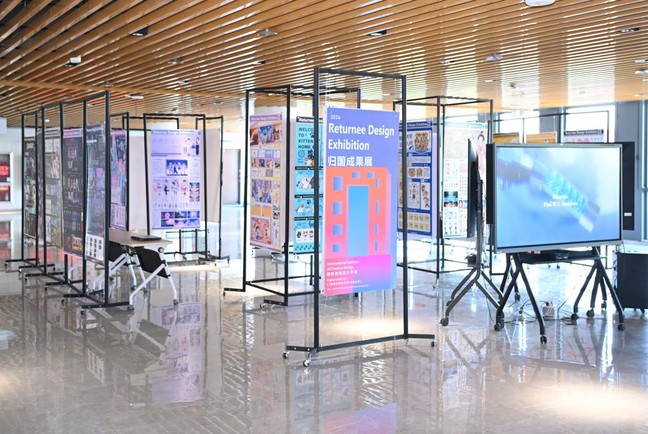 在学校持续推进国际化办学与高质量人才培养,加快建设世界一流设计学科的背景下,1月13日,一场融合中外合作办学成果、前沿AIGC辅助设计技术与头部企业深度参与的“映•像”主题数字媒体艺术(中韩合作)归国课程成果展在校园公共展陈空间精彩呈现。本次中韩合作办学背景下的归国成果展,展示了数字媒体艺术(中韩合作)专业三年级学生在韩国东西大学完成为期一年的海外学习后,回国形成的系统性课程创作成果,全面呈现了中外协同培养模式在课程建设与学生能力提升方面的阶段性成效。学生在韩国东西大学学习期间,课程内容紧贴国际数字内容与影像产业发展趋势,他们在跨文化语境中参与协作式创作,为归国后的课程深化奠定了坚实基础。学院青年骨干教师聂莎博士全程带领并引导学生完成策展与布展全过程。展览以学生海外学习与跨文化创作为主线,围绕3D影像设计、虚拟现实基础、影像音效编辑、动态图形设计、场景设计等核心课程方向展开。展览期间,阿里国际AIGC业务总监、AITIC业务负责人黄追阳,阿里国际AITIC商务负责人刘辛铭一行到访国际创意设计学院并观展,与学院领导班子、骨干教师围绕国际化人才培养标准共建、国际产业学院培育以及设计学科垂直
