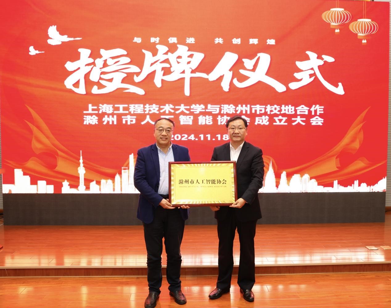 会上,吴劲书记为滁州市人工智能协会授牌,上海市数据智能及其应用协同创新中心主任方志军为协会揭牌。滁州市人工智能协会是我校滁州产业研究院牵头发起的行业协会,协会的成立标志着滁州市人工智能行业在凝聚力、集合力、创新力上迈出了新的步伐,具有里程碑意义。
