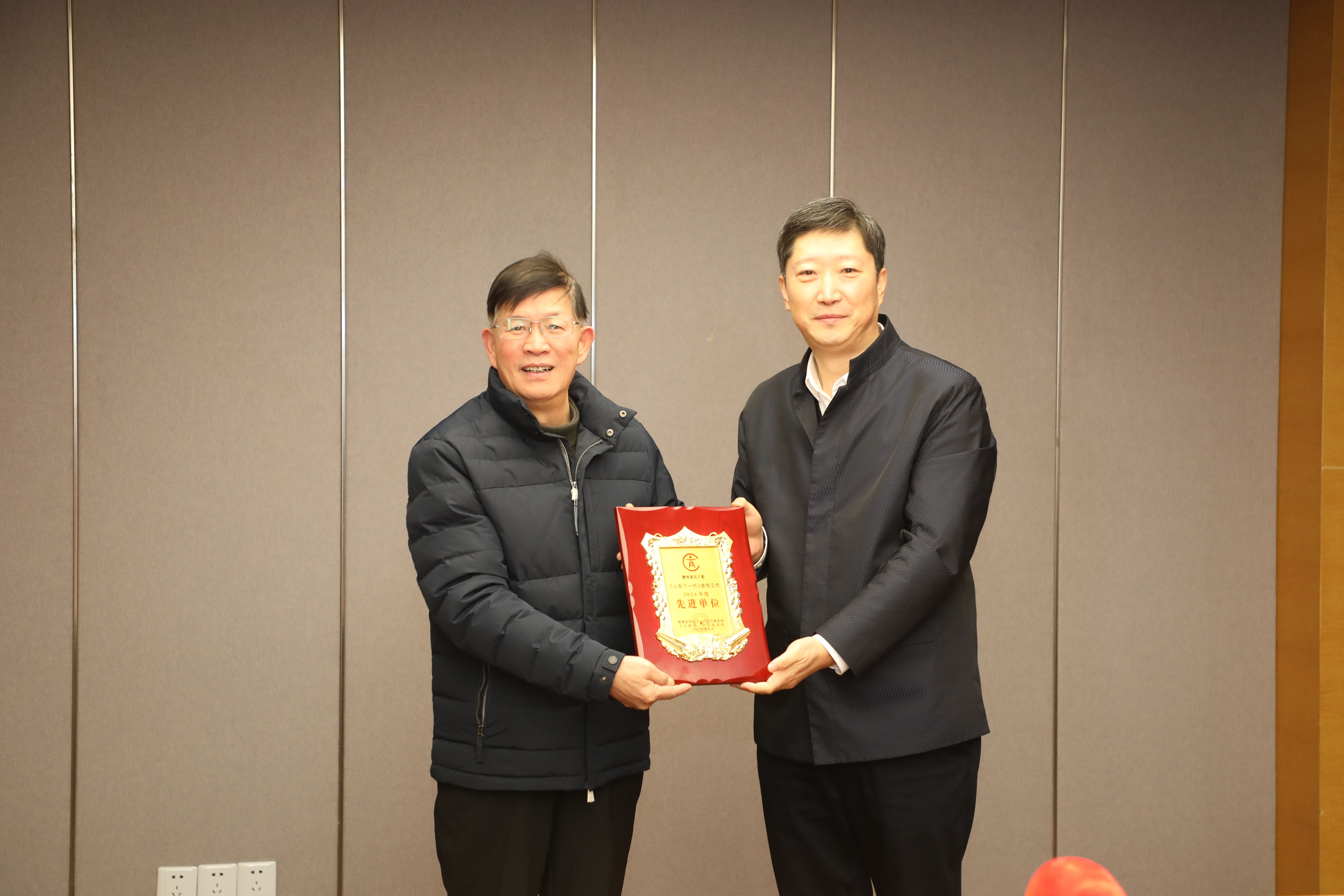 校关工委荣获2024年“教育部心系下一代宣传工作先进单位”,李江为老领导代表田信灿颁发了奖牌。