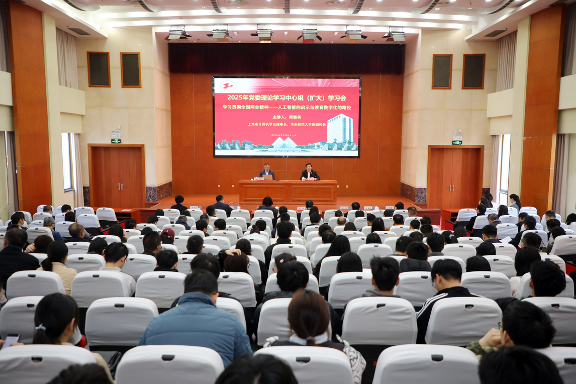 3月21日上午,学校举行党委理论学习中心组(扩大)学习会,特邀上海市计算机学会理事长、华东师范大学原副校长周傲英教授作《学习贯彻全国两会精神——人工智能的启示与教育数字化的路径》专题辅导报告。校党委理论学习中心组成员、全体中层干部、相关学院师生代表参加会议,会议由副校长夏春明主持。