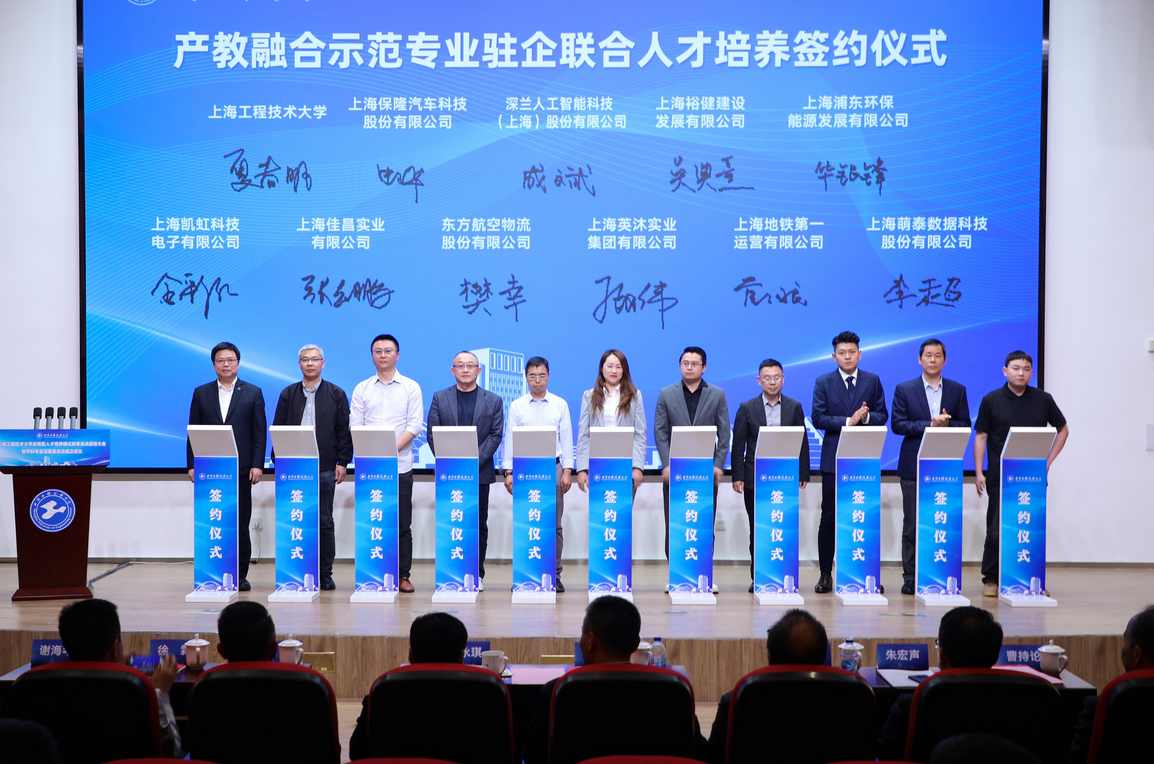 学校与上海保隆汽车科技股份有限公司、深兰人工智能科技(上海)股份有限公司、上海裕健建设发展有限公司、上海浦东环保能源发展有限公司、上海凯虹科技电子有限公司、上海佳昌实业集团、东方航空物流股份有限公司、上海英沐实业集团有限公司、上海地铁第一运营有限公司、上海萌泰数据科技股份有限公司10家企业签署产教融合示范专业住企联合人才培养协议。夏春明与10家企业代表上台签约。
