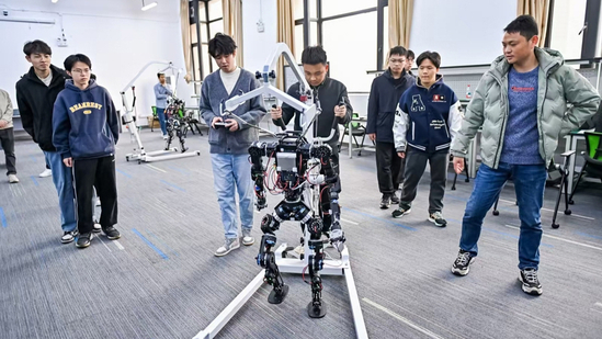 上海电机学院“具身智能机器人场景应用联合实验室”的课堂上,学生正在学习装配、调试、训练机器人。