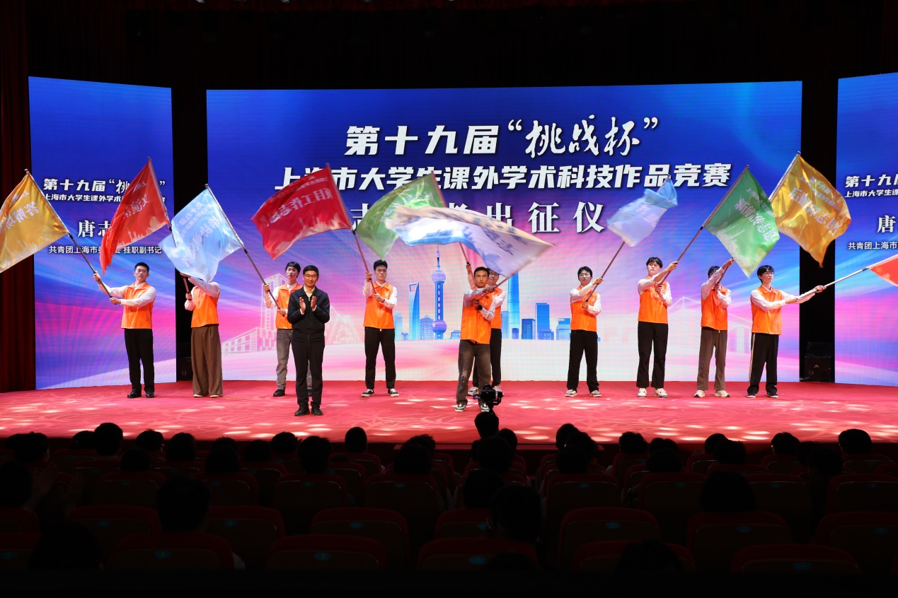 唐志宇为第十九届“挑战杯”上海市大学生课外学术科技作品竞赛志愿服务总队授旗。赛事组委会秘书处组建接待服务、项目工作、展会服务、答辩场馆等多支志愿服务队,全体志愿者整装待发。