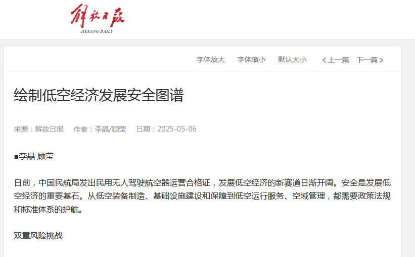 日前,中国民航局发出民用无人驾驶航空器运营合格证,发展低空经济的新赛道日渐开阔。安全是发展低空经济的重要基石。从低空装备制造、基础设施建设和保障到低空运行服务、空域管理,都需要政策法规和标准体系的护航。