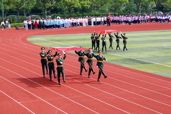 国旗护卫队迈着整齐的步伐,护送国旗走向升旗台,现场举行了庄严的升国旗仪式。