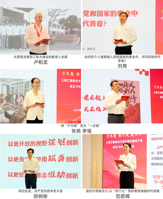 光荣在党50年退休党员代表卢柏龙,管理学院党委书记范君晖,科研处处长、党支部书记郑树彬,马克思主义学院党委青年党员刘隽,材料科学与工程学院副院长、党支部书记张艳,上海美维电子有限公司经理、党支部委员李强,分别聚焦追忆初心、服务西部主动担当、攻坚产教融合、创新科研事业、党建领航事业发展等做了交流分享。