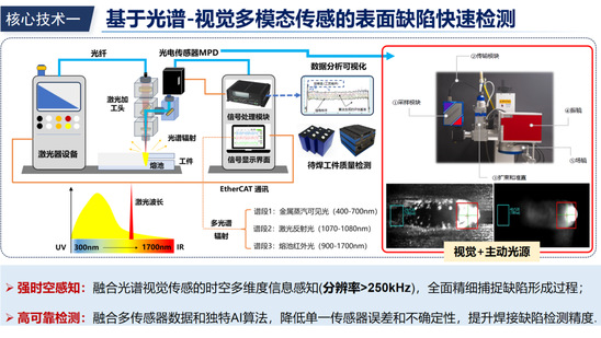 其核心技术创新在于将焊接执行模块与智能监测、动态管控模块深度集成,搭配自主知识产权的“工艺机理+AI赋能”的激光焊接智能诊断系统。主要由多光谱传感、主动视觉和光学相干断层扫描OCT三种光学传感技术构成,通过集成工艺机理、全过程监测、AI学习模型和中央监控四个关键步骤,形成 “加工即监测、监测即管控” 的闭环技术体系,解决传统激光装备“重加工、轻诊断、难管控”的行业痛点。