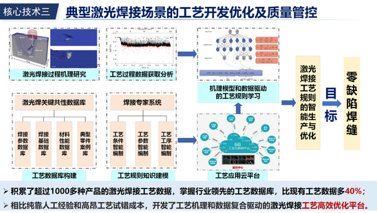 形成了超过1000多种不同焊接场景(激光光源+金属材料)的工艺知识数据库,开发了基于数据-机理融合驱动的激光焊接工艺高效优化及质量管控平台,从而减少纯靠人工经验和高昂工艺试错成本,最终获得零缺陷焊缝目标。
