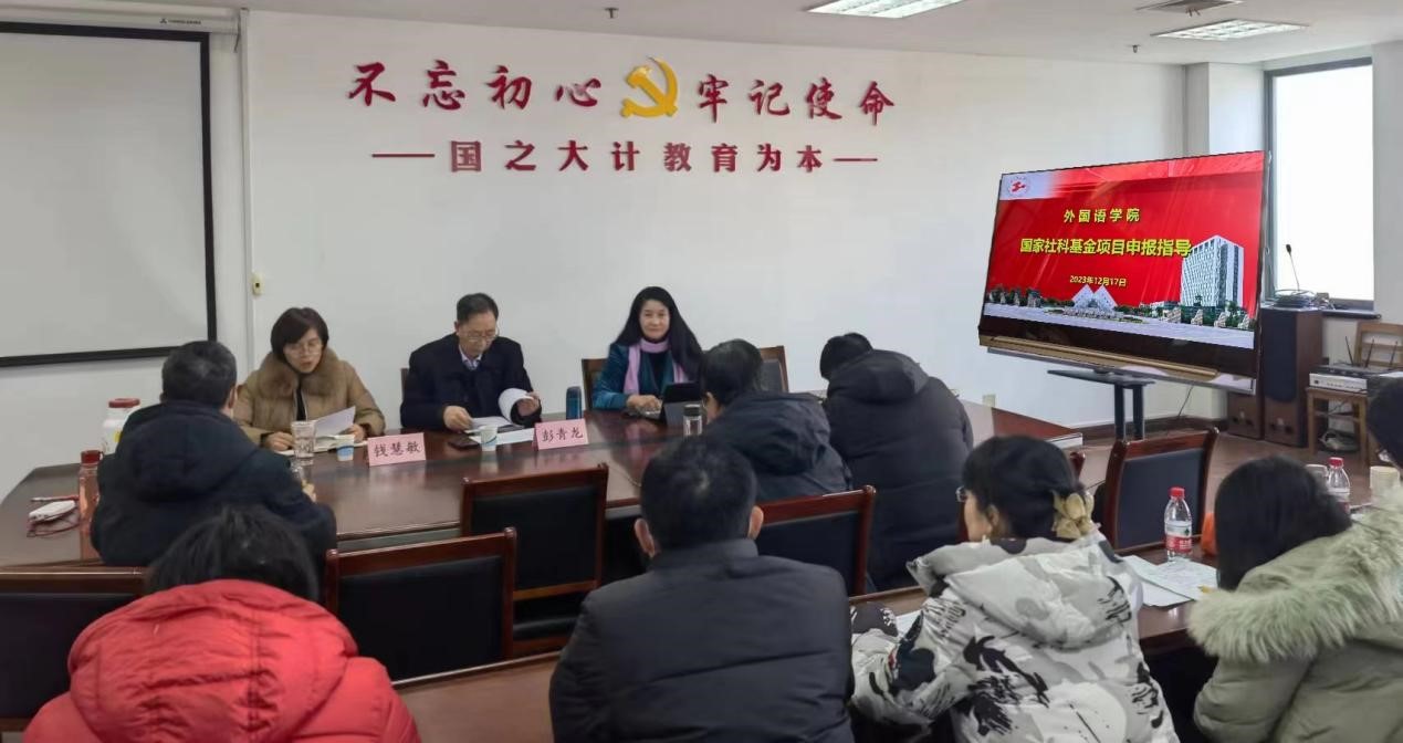 为了提升外国语学院教师的科研水平,开阔学术视野,进一步做好国家社会科学基金项目申报工作,12月17日,外国语学院在行政楼1508举办国家社科基金项目申报辅导会,会议由数理外国语联合党委书记钱慧敏教授主持,学院中青年骨干教师参加。会议邀请上海交通大学彭青龙教授和南京师范大学林敏洁教授做专题辅导,