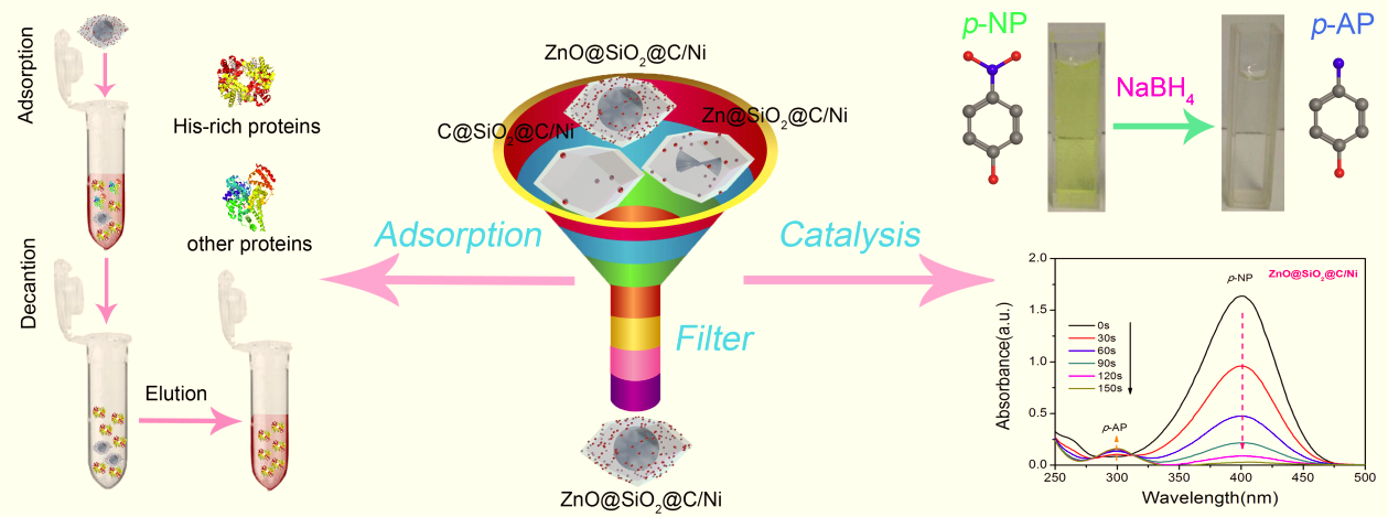 多酚广泛存在于日常蔬菜、水果、茶及中药材中,其含量仅次于木质素、纤维素,是植物抵抗紫外线、抗氧化、预防病虫和细菌入侵所发展出来的防御体系。随着材料科学的不断发展,近年来利用植物多酚极为丰富的物理化学特性,设计和构造多功能纳米粒子的研究也不断涌现,在生物医学、催化等领域展示出了巨大潜力。张敏教授团队围绕“基于多酚化学的功能化修饰”开展了一系列工作,发展了一步法镍离子参与的酚醛树脂共聚技术,在氮气保护下煅烧后,构建高密度镍颗粒负载的纳米复合材料,并将其应用于4-硝基苯酚催化以及富组氨酸类蛋白的吸附。2020年以来张敏教授团队在镍基方面的其它文章发表在以下期刊:Inorganic Chemistry., 2020, 59, 9356-9363(IF 4.825, 二区);Dalton Trans., 2020,49, 2570-2577(IF 4.174, 二区);Applied Surface Science., 2020,509, 14538(IF 6.182, 二区);ACS Appl. Nano Mater., 2020, 3, 5, 4623-4634;Colloids and Surfaces A: Physicochemical and Engineering Aspects., 2020, 586,124211(IF 3.99, 三区);CrystEngComm., 2020, 22, 5302-5309(IF 3.117, 二区);New J. Chem., 2020, 10.1039/D0NJ02916E(IF 3.288, 三区)等。上述研究工作受到上海市自然科学基金的支持(18ZR1416400)。