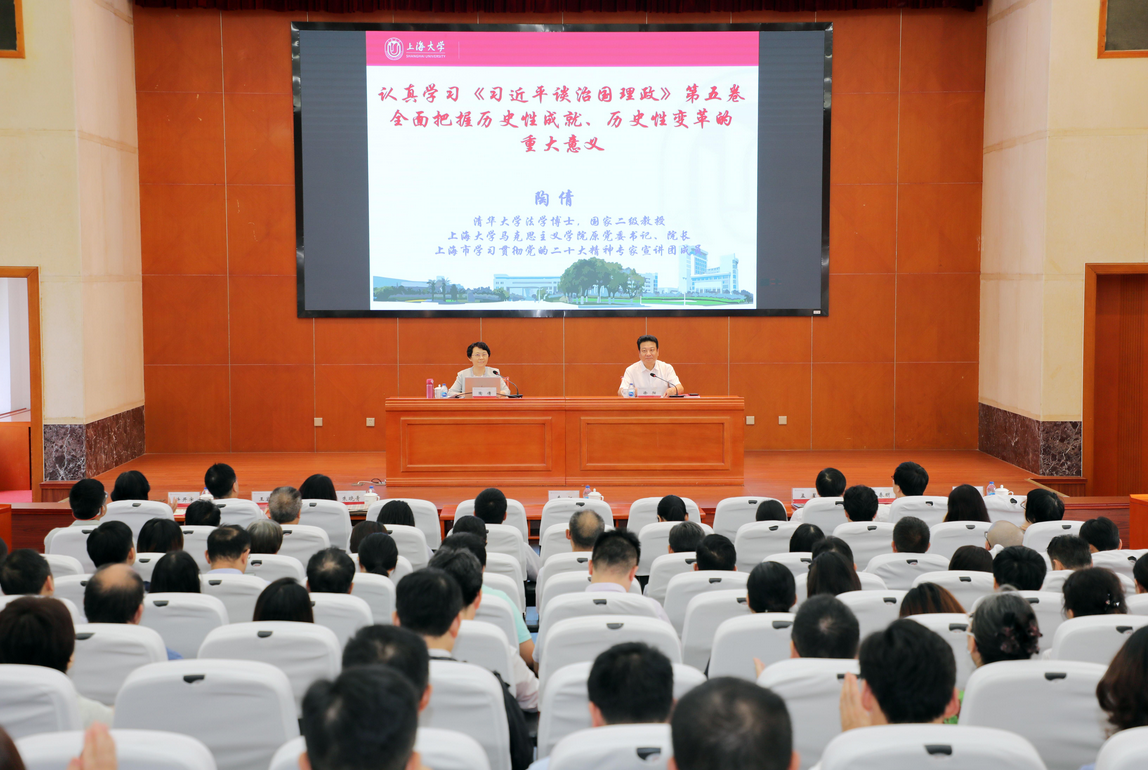 9月19日下午,学校举行党委理论学习中心组(扩大)学习会,特邀上海大学陶倩教授为我们作《认真学习习近平谈治国理政第五卷,全面把握历史性成就、历史性变革的重大意义》专题辅导报告。校党委理论学习中心组成员、中层干部、师生代表参加会议,会议由校党委副书记、副校长徐阳主持。陶教授以深厚的理论功底和深刻的学术见解,全面、系统、深入地解读了《习近平谈治国理政》第五卷所蕴含的理论意义、历史意义、实践意义和世界意义,帮助我们进一步深入学习领会习近平新时代中国特色社会主义思想的最新成果,对于我们持续深入学习贯彻党的创新理论,具有重要的指导和推动作用。徐阳在主持会议中指出,学校广大党员干部要以本次中心组学习为契机,深刻把握《习近平谈治国理政》第五卷中蕴含的马克思主义立场、观点、方法,不断提高运用党的创新理论指导实践、推动工作的能力,切实把学习成果转化为锚定“世界一流应用创新型大学”奋斗目标的具体思路和扎实行动。