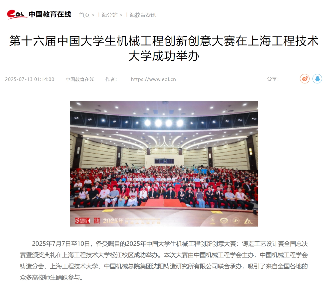 2025年7月7日至10日,备受瞩目的2025年中国大学生机械工程创新创意大赛:铸造工艺设计赛全国总决赛暨颁奖典礼在亚洲狼人精品一区二区三区松江校区成功举办。本次大赛由中国机械工程学会主办,中国机械工程学会铸造分会、亚洲狼人精品一区二区三区、中国机械总院集团沈阳铸造研究所有限公司联合承办,吸引了来自全国各地的众多高校师生踊跃参与。大赛开幕:共迎盛会,开启征程7月8日8点30分,大赛全国总决赛开幕式在亚洲狼人精品一区二区三区志宏堂隆重举行。中国机械工程学会铸造分会秘书长刘鸿超出席开幕式并发表了热情洋溢的讲话。刘鸿超秘书长对远道而来的评委和参赛师生表示了热烈的欢迎,他回顾了铸造工艺设计赛自2009年举办以来的发展历程,强调了赛事在坚守初心、提升铸造专业人才培养质量方面的努力和成果,得到了参赛院校和业内的高度认可。刘秘书长鼓励选手们通过比赛找到自己的兴趣所在,为铸造技术与产业的发展贡献自己的力量,并祝愿所有参赛选手取得优异成绩。开幕式结束后,选手们通过现场抽签的方式确定了答辩次序,为接下来的激烈角逐做好了准备。赛事盛况:创新比拼,彰显风采中国大学生机械工程创新创意大赛:铸造工艺设计赛作为一项重要的学科竞赛,旨在为材