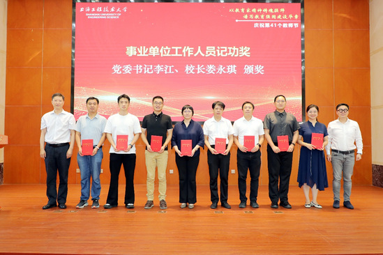 为庆祝第41个教师节,弘扬尊师重教传统,凝聚育人奋进力量,9月16日上午,学校聚焦“以教育家精神铸魂强师,谱写教育强国建设华章”主题,召开庆祝第41个教师节座谈会暨表彰会。校党委书记李江,校长娄永琪,党委副书记朱晓青,党委副书记、纪委书记孟星,党委副书记、副校长徐阳,副校长王岩松、夏春明、许开宇,校领导史健勇出席会议,各职能部门、各院(部、中心)、直属单位党政负责人,获奖教师,各学院教师及学生代表参加会议。