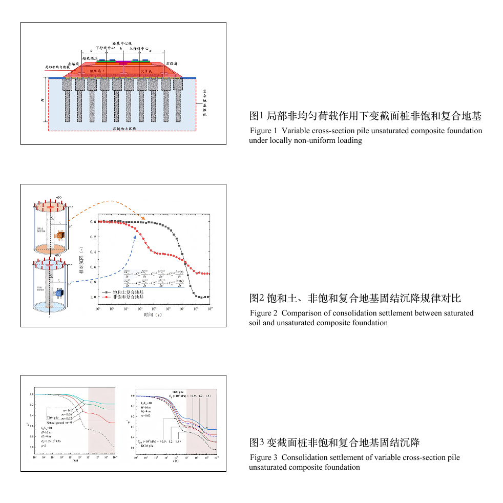 另外,在“双碳”目标下,如何在控制路基沉降的同时又可以节约材料成了固结理论提出的关键考虑因素。课题组近十年针对这一系列问题展开了系统攻关,分别提出了排水桩、不排水桩和变截面桩非饱和复合地基固结理论,并发现饱和复合地基的固结沉降量比非饱和复合地基的高30%-50%,且稳定时间更长(图2)。变截面桩加固的非饱和复合地基,通过桩土协同作用大幅提升了承载能力,兼具沉降控制好、经济环保的明显优势(图3)。