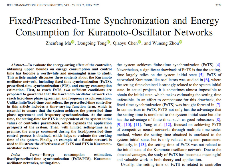 近期,电子电气工程学院童东兵教授指导硕士研究生马振峰在顶级期刊《IEEE Transactions on Cybernetics》,发表题为“Fixed/prescribed-time synchronization and energy consumption for Kuramoto-oscillator networks”的最新研究成果。该期刊是美国电气与电子工程师学会会刊,系国际自动化与控制系统领域中科院SCI一区顶级期刊,2025年影响因子为10.5。Kuramoto 振子模型是一种用来描述大量耦合振子同步行为的数学模型。该模型所有振子都是完全相同的,相互之间的耦合很弱、并且任意两个振子之间的相互作用强度取决于它们相位差的正弦。而耦合振子在同步过程,不可避免的要消耗能量。该论文研究了Kuramoto振子网络的固定时间同步和指定时间同步以及同步过程中能量消耗估计问题。该项研究得到国家自然科学基金面上项目和上海市自然科学基金面上项目的资助。