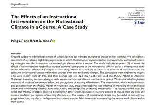 近日,由外国语学院李明副教授作为第一作者撰写的学术论文“The Effects of an Instructional Intervention on the Motivational Climate in a Course: A Case Study”在国际高水平期刊SAGE OPEN(SSCI Q2, 中科院分区Q4,影响因子2.1)在线发表,该研究得到上海市教委《上海高校中青年教师国外访学进修计划》项目的资助。本研究聚焦高校课堂教学中的激励性氛围构建问题,采用案例研究方法,系统探讨一项教学干预措施在实际课程中的应用成效。研究结果对于提升学生学习积极性、改善课堂氛围及推动教学改革具有现实意义与理论价值。本研究的发表,体现我校教师在高等教育研究领域的持续探索与学术影响力,也为推动教育质量提升提供有力研究支持。
