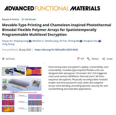 化学化工学院宋仕强副教授指导研究生在仿生智能材料领域发表最新研究成果来源:化学化工学院撰稿:宋仕强近日,化学化工学院宋仕强副教授指导硕士研究生安新妍、杨旭分别在学术期刊《Advanced Functional Materials》(中科院一区Top,影响因子19)、《Composites Part B: Engineering》(中科院一区Top,影响因子14.2)上发表了题为“Movable-type Printing and Chameleon-Inspired Photothermal Bimodal Flexible Polymer Arrays for Spatiotemporally Programmable Multilevel Encryption”和“Bioinspired Janus Interlocked MXene/Perovskite-PDMS Composites for Integrated Thermal Visualization, Rapid-heat Dissipation, and Proactive Fire Safety in High-Po