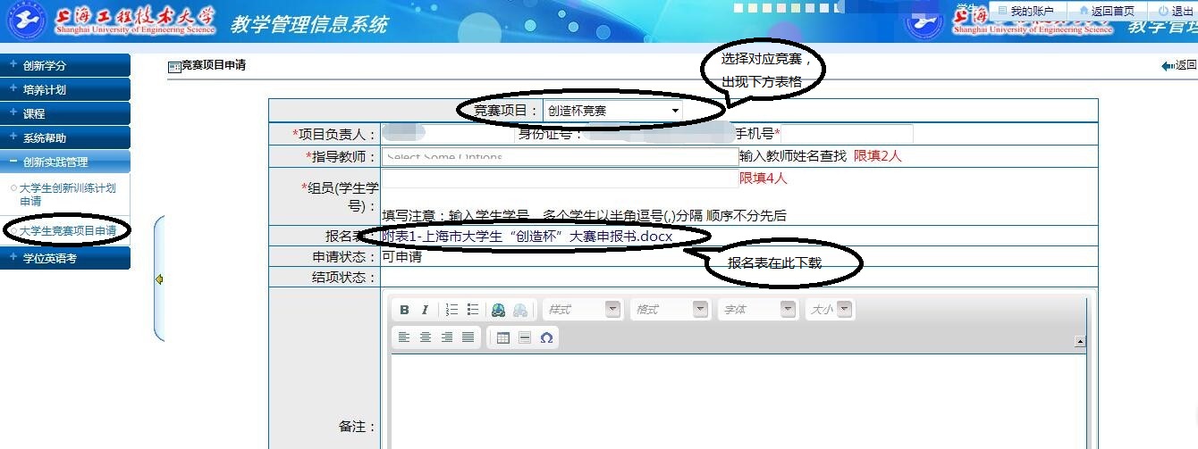 请各参赛队以队伍为单位,由队长在“教学管理信息系统-创新实践管理-大学生竞赛项目申请”中进行报名及大赛申报书下载。