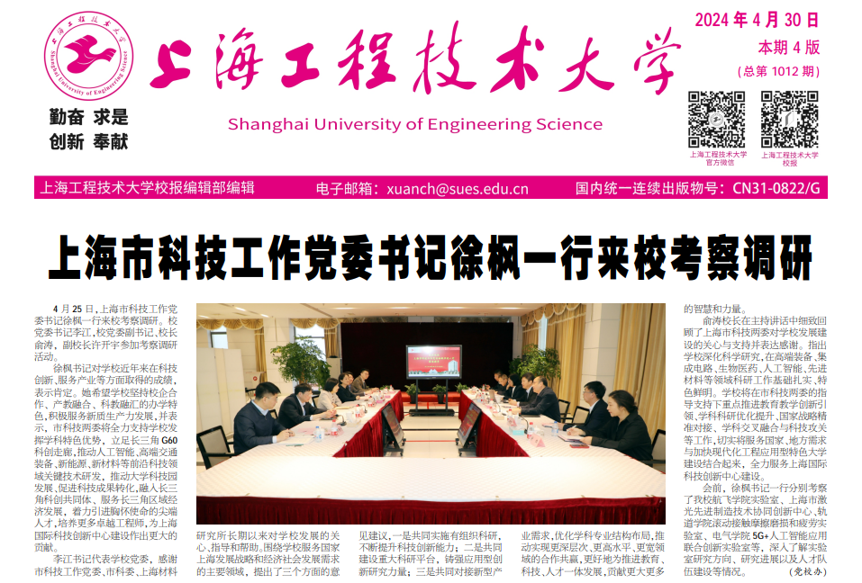 4月25日,上海市科技工作党委书记徐枫一行来校考察调研。校党委书记李江,校党委副书记、校长俞涛,副校长许开宇参加考察调研活动。
