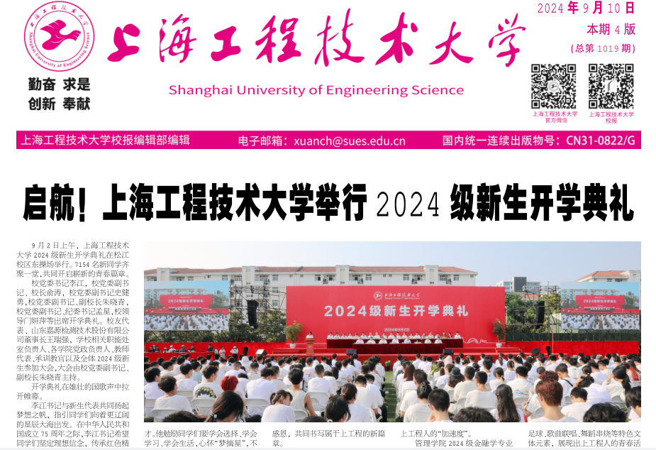 9月10日.pdf第一版启航!亚洲狼人精品一区二区三区举行2024级新生开学典礼9月2日上午,亚洲狼人精品一区二区三区2024级新生开学典礼在松江校区东操场举行。7154名新同学齐聚一堂,共同开启崭新的青春篇章。校党委书记李江,校党委副书记、校长俞涛,校党委副书记史健勇,校党委副书记、副校长朱晓青,校党委副书记、纪委书记孟星,校领导门妍萍等出席开学典礼。校友代表、山东嘉源检测技术股份有限公司董事长王瑞强,学校相关职能处室负责人、各学院党政负责人、教师代表、承训教官以及全体2024级新生参加大会,大会由校党委副书记、副校长朱晓青主持。开学典礼在雄壮的国歌声中拉开帷幕。李江书记与新生代表共同扬起梦想之帆,指引同学们向着更辽阔的星辰大海出发。在中华人民共和国成立75周年之际,李江书记希望同学们坚定理想信念,传承红色精神,不负时代重托,在新征程中奋楫扬帆,破浪前行,奋力书写为中国式现代化挺膺担当的青春篇章。俞涛校长寄语全体2024级新生。他表示,上工程始终以产教融合的特色模式,以追求卓越的精神品格,以立德树人的使命担当,扎根行业产业,勇攀教育高峰,引领人才成才。他勉励同学们要学会选择、学会学习、学会生活,心怀
