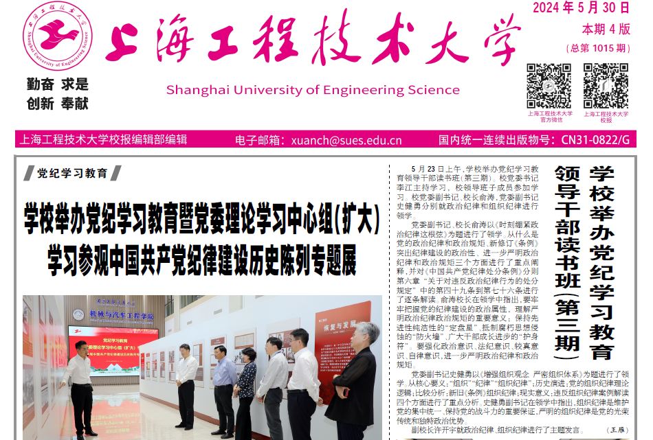 第一版【党纪学习教育】学校举办党纪学习教育暨党委理论学习中心组(扩大)学习参观中国共产党纪律建设历史陈列专题展5月28日下午,学校举办党纪学习教育暨党委理论学习中心组(扩大)学习会,参观中国共产党纪律建设历史陈列专题展,学习会特邀全国红色旅游“五好”讲解员、全国革命文物“百佳讲述人”、陈云纪念馆文博馆员高智亮来校作讲解。校党委中心组成员、相关职能处室负责人、学生宣讲团代表参加了会议。本次展览由武汉革命博物馆与亚洲狼人精品一区二区三区联合主办,于我校松江校区现代交通工程中心一楼展出。此次展览分为“创立与探索”“推进与曲折”“恢复与发展”“新时代新征程”四部分,是国内第一个全面反映党的纪律建设历史的展览,系统梳理了中国共产党纪律建设的历程,全面、客观、真实反映了中国共产党在不同历史时期的纪律建设理念、战略方针及主要成果。与会同志参观学习后表示,要以习近平新时代中国特色社会主义思想为指导,通过对中国共产党纪律建设历史的学习和掌握,常怀律己之心,坚定理想信念,继承革命先烈遗志,弘扬党的优良传统和