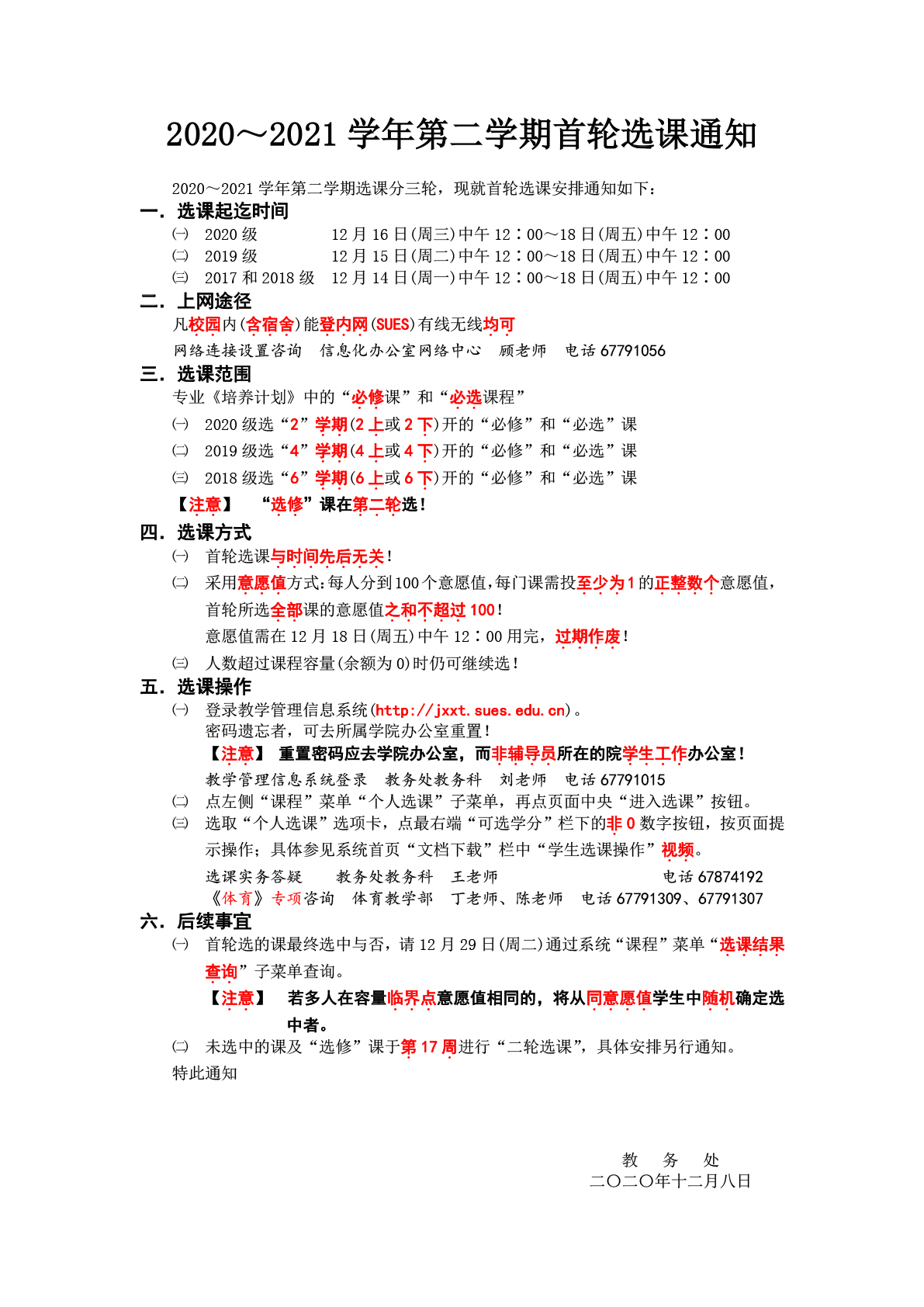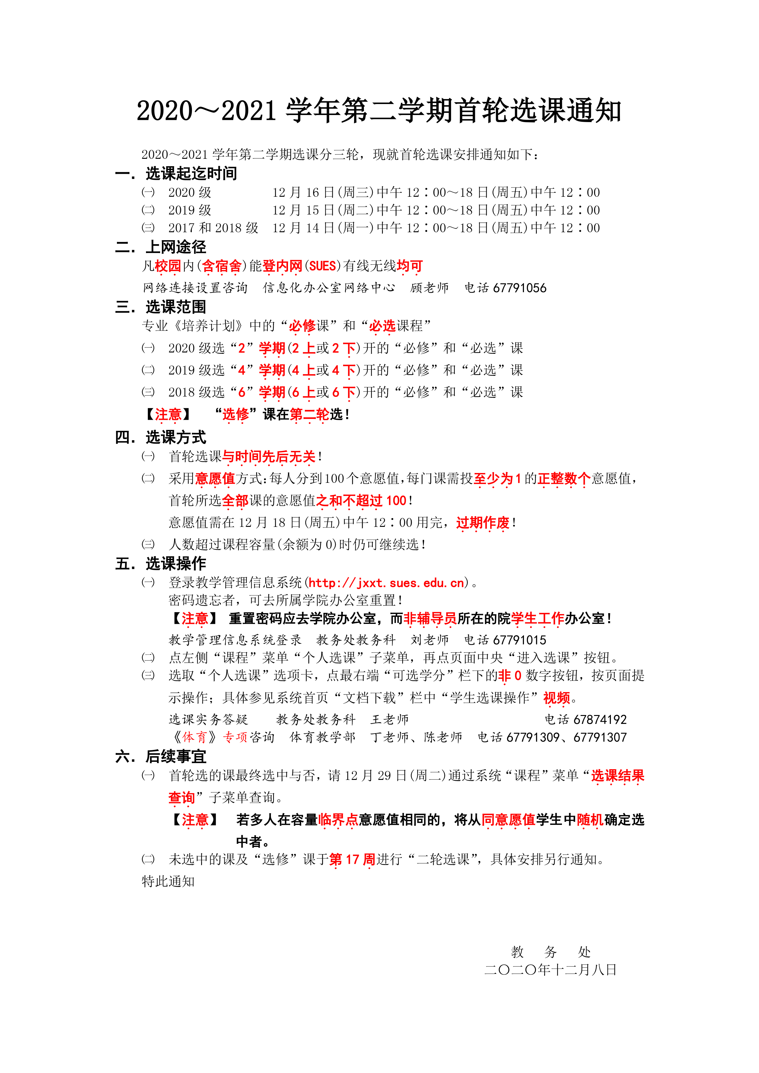 2020~2021学年第二学期首轮选课通知