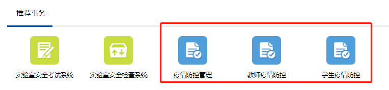 二、在“推荐事务”里找到相应图标,点击不同的链接,可以进入相应模块,填写表单内容并提交。学生点击进入“学生疫情防控”,教师点击进入“教师疫情防控”,管理员点击进入“疫情防控管理”。