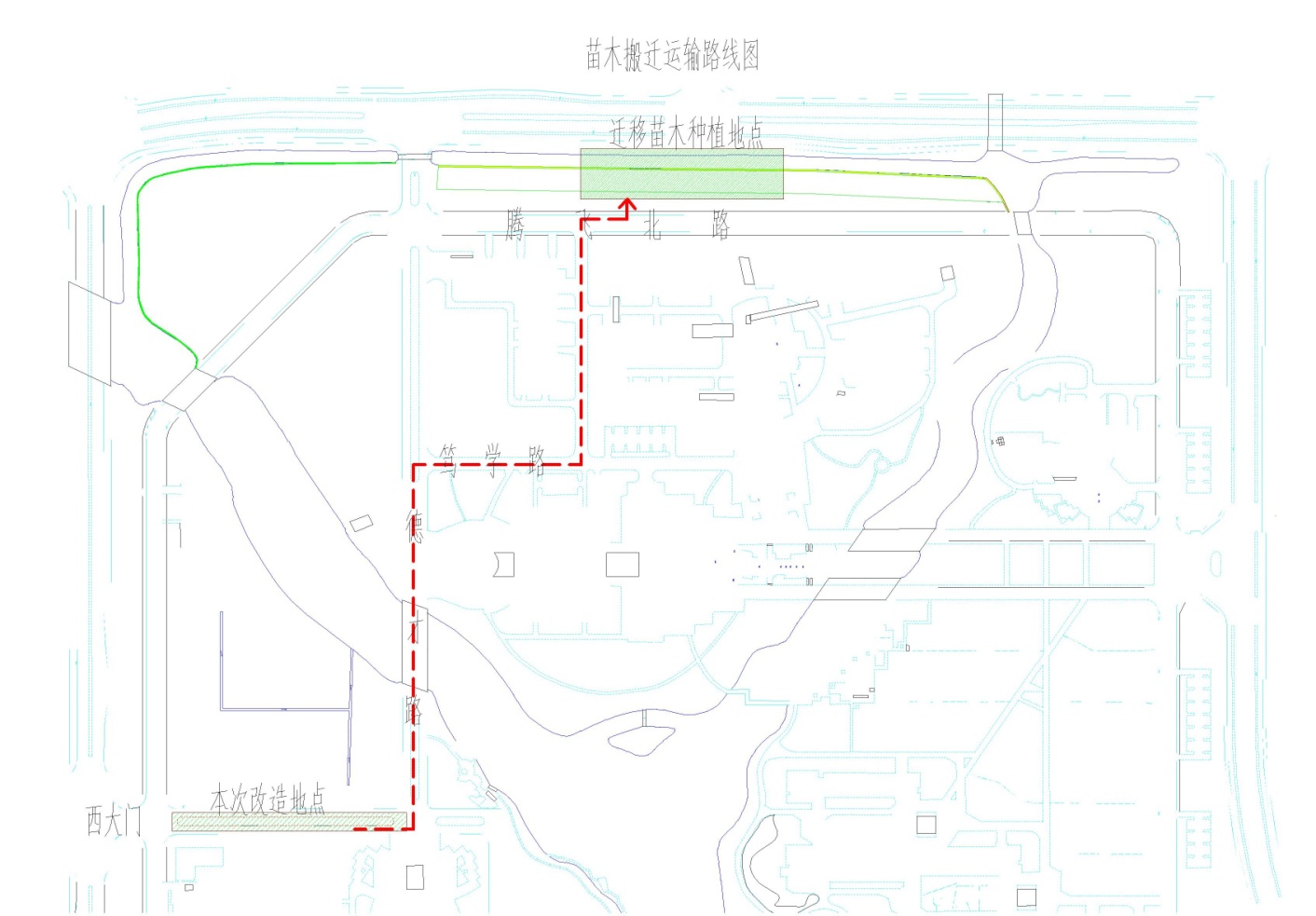 考虑到项目施工时间短,搬迁和种植期间都要沿线进行卸苗和装运,施工期间将进行半封闭施工(全天在西大门中央绿化带施工区域路南侧进行圆锥和拉警示绳的临时围),短驳车辆使用2吨卡车进行短驳,苗木采用随挖随运的方式进行移植,移植苗木的短驳路线:治学路(起挖地点)—德才路—笃学路-腾飞北路(原苗木移植地点),施工期间请师生注意避让,对大家造成的不便表示歉意。