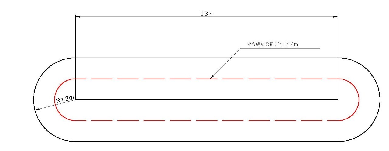 赛道宽度1.2米,形成长约15.4米宽约2.4米(不计赛道边缘道牙厚度)的环形赛道,其中两直线段长度为13.0米,两端外缘为曲率半径1.2米的2个四分之一圆形和一个0.5米直线段组成,中心线总长度约31米,如图3所示。