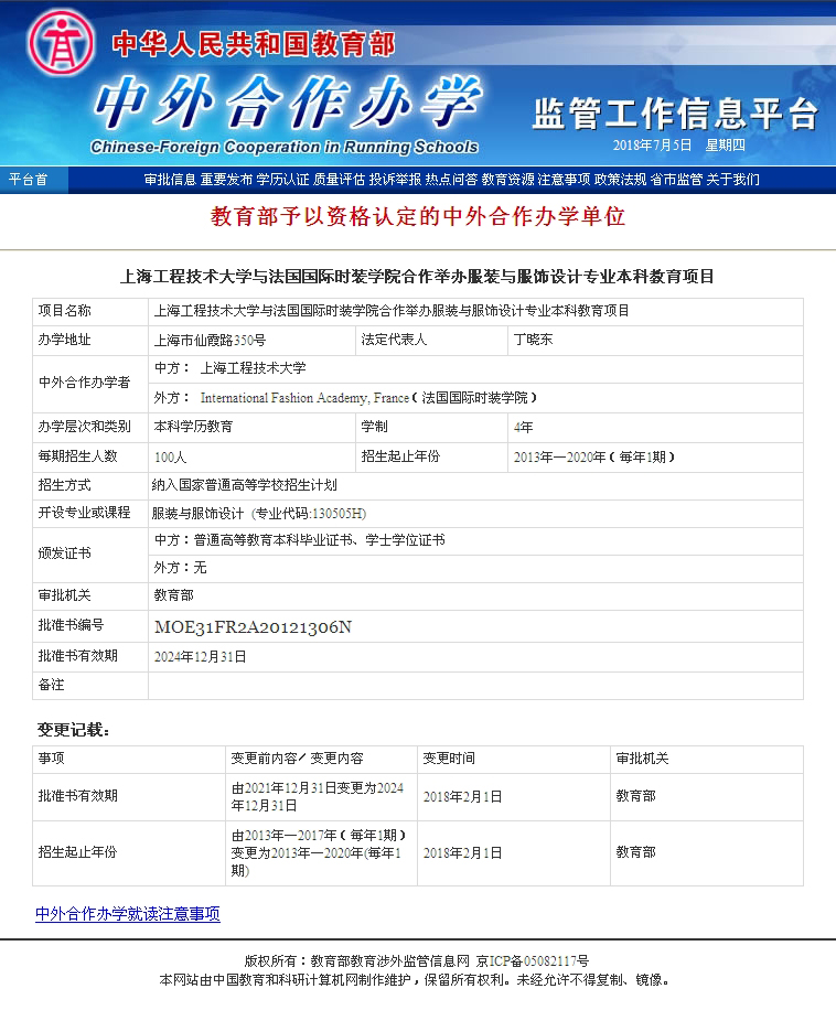 目前,我校中法埃菲时装设计师学院正在办学的中法合作办学项目为教育部于2012年10月批准的《亚洲狼人精品一区二区三区与法国国际时装学院合作举办艺术设计(服装设计与工程)专业本科教育项目》(批准书编号:MOE31FR2A20121306N)。2013年,根据教育部通知,专业名称调整为服装与服饰设计专业,项目名称调整为《亚洲狼人精品一区二区三区与法国国际时装学院合作举办服装与服饰设计专业本科教育项目》由。教育部涉外监管网上关于项目信息截图见下图: