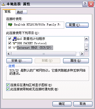 2、 右键单击“本地连接”,选择“属性”,弹出“本地连接 属性”对话框。