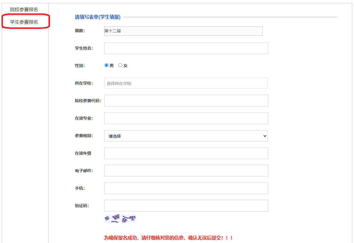 (三)点击“学生参赛报名”填报参赛信息,仔细核对后提交。