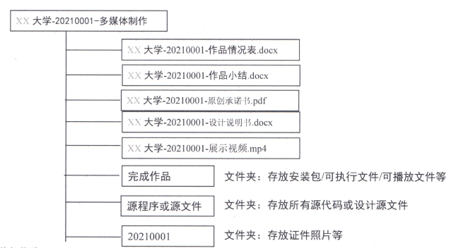 (5) 所有电子版提交内容保存在以“学校-参赛编号-作品类别(8选1)”命名的文件夹中,并上传至百度云,创建私密链接(永久有效)后提交链接地址和密码。百度云上的目录结构及提交的文件应为: