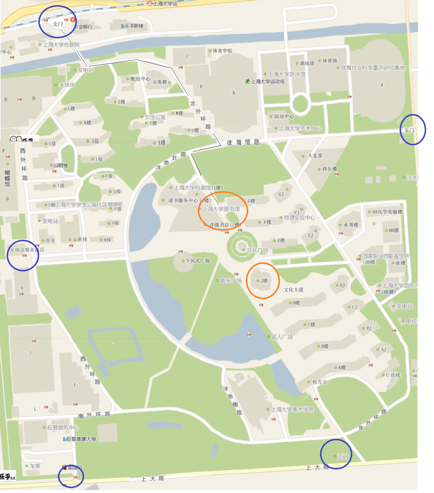 图书馆、J楼位置见下图(红色圈为图书馆与J楼标志,蓝色圈为进入门标志):