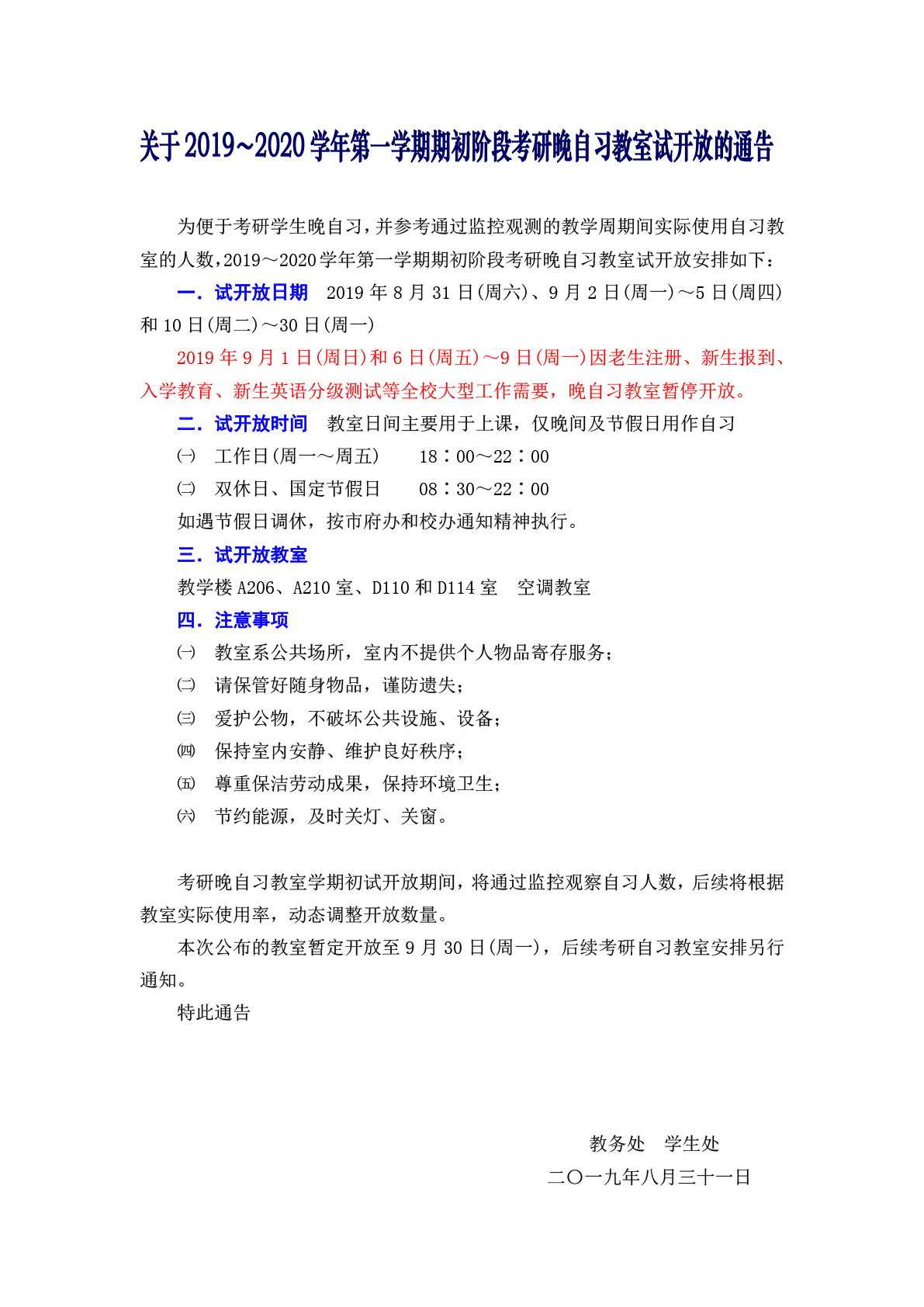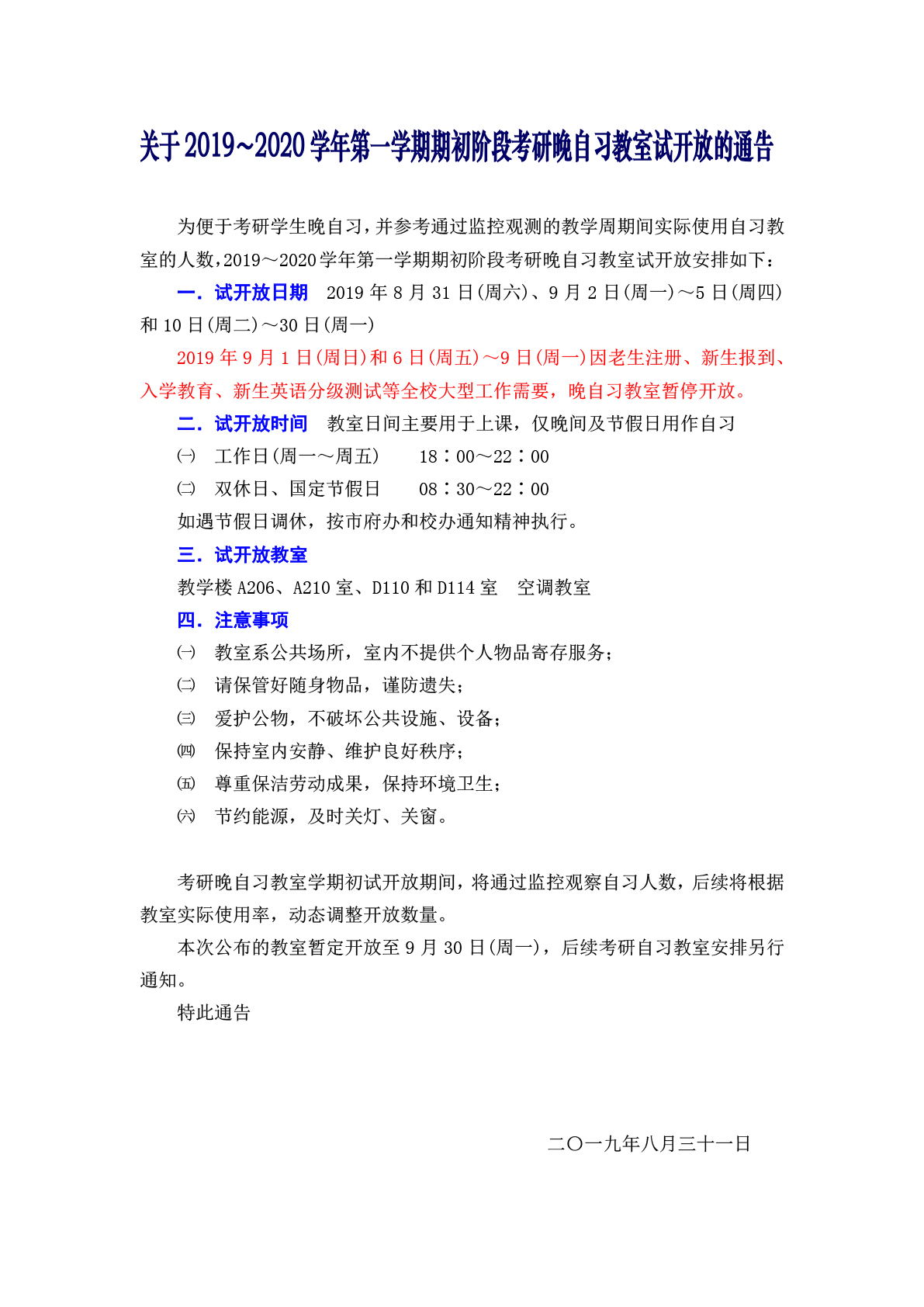 关于2019-2020学年第一学期期初阶段考研晚自习教室试开放的通告