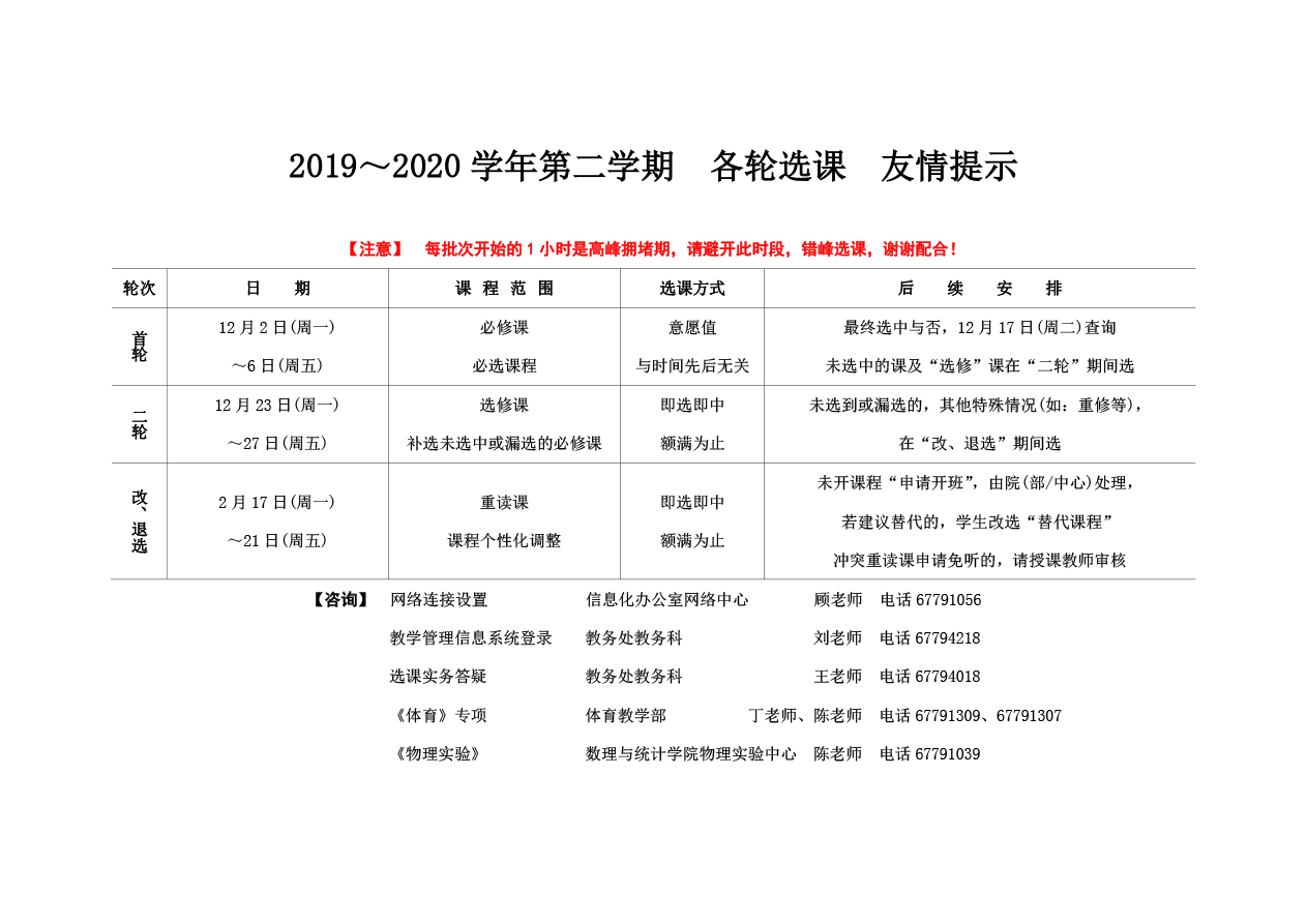 2019~2020学年第二学期 二轮选课通知 各轮选课友情提示