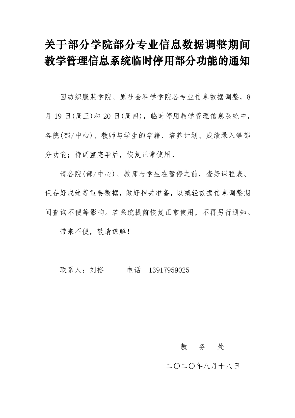 关于部分学院部分专业数据信息调整期间教学管理信息系统临时停用部分功能的通知